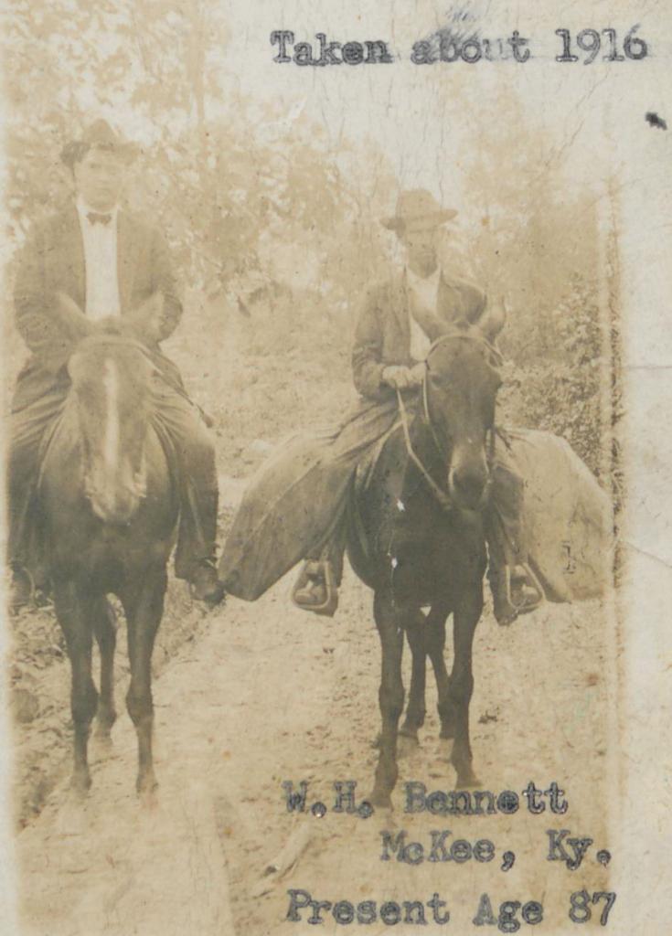The image below is a detail from a poor quality photo postcard from circa 1916. There are two men on horseback. The man on the right is identified as W. H. Bennett of McKee, Kentucky, whose age (in 1959) was 87 years. His horse has two mailbags, one on each side to distribute the burden. The other man is not identified. There are trees and other vegetation behind them but no buildings are visible.